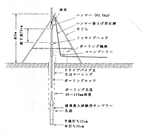 標準貫入試験とは、深さ1mごとに、土の硬軟・締まり具合を判別するためのN値を求めるとともに土を採取して土の種類、地層構成を調べます。