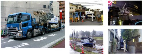 施工機械は、現場への搬入経路を考慮しながら、各種施工機械の重量・寸法に対応するセルフトラック、トレーラー等で搬入を行います。