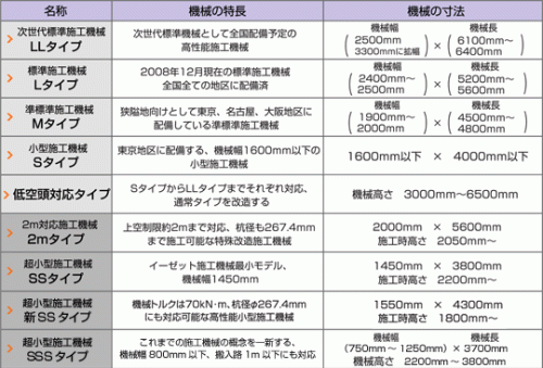 機械サイズにほぼ対応する形で大別して4種類に分かれ、施工現場の環境に応じた施工機械を柔軟に選択することが可能です。