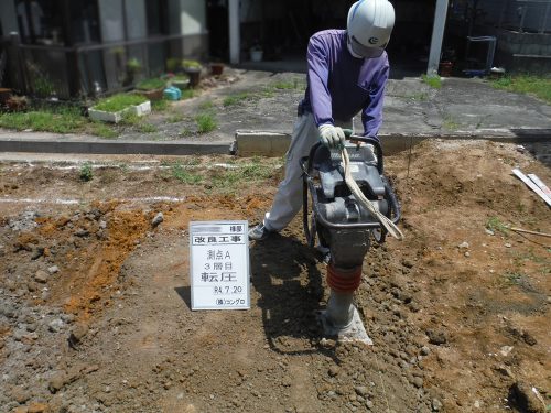 地表面から比較的浅いところに軟弱な層がある場合は、セメント系固化材と原地盤を混合攪拌し転圧(締固め)により地盤を改良する工法です。