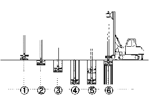 セメント系固化材に水を加えスラリー状にしたセメントミルクを攪拌翼の先端部から地盤に注入しながら混合攪拌し、柱状のコラムを築造する工法です。