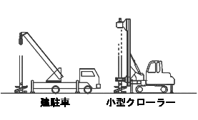 施工は、専用に開発された施工機械で行います。現場の状況や搬入状況、改良径や改良長さ地盤条件などを考慮して施工機械を選択します。当社では、現場および施工条件に合わせて小型クローラー式、建柱車など、施工機械を使い分けています。