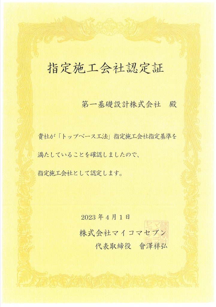 当社はトップベース工法指定施工会社に認定されました。